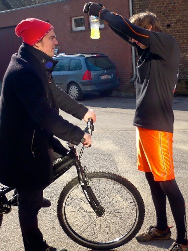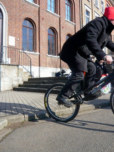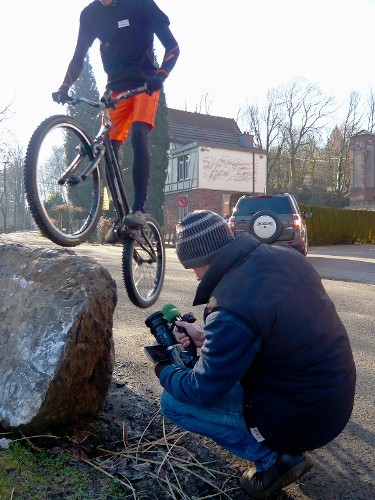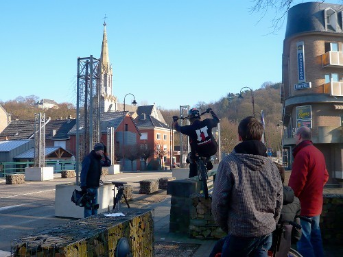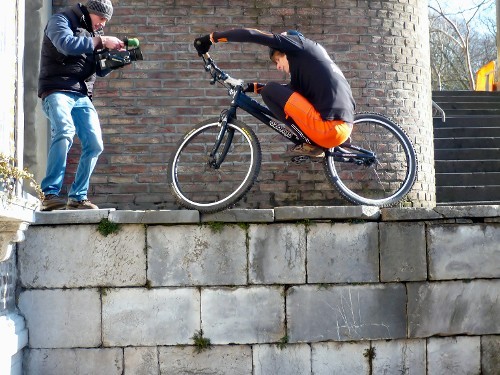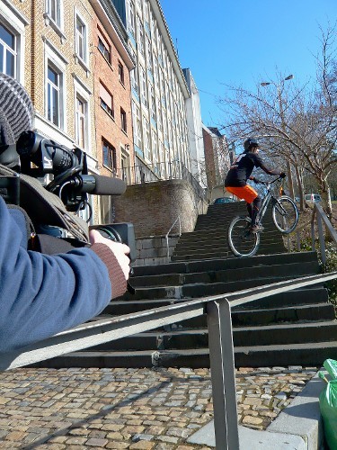 Vor der Fahrt zum Drehort gibt es einige Transportschwierigkeiten: Wir müssen ein Fahrrard, einen Rollstuhl und eine Kamera mitnehmen. Letztendlich sind wir mit 2 Wagen gefahren. Schon vor den Aufnahmen beeindruckt Pierre-Charles das Team und einige Passanten. An seinem Fahrrad, und später an seinem Helm, wird eine kleine Kamera befestigt. Er spricht mit dem Kameramann ab, wo er springen soll. Allan spielt mehrmals Assistent, um Essen und Getränke zu holen und macht einige Aufnahmen. Während der Aufnahmen gab es ständig Zuschauer. Selbst die Polizei beobachtet die Stunts. Beim Drehortwechsel vergessen die Kameramänner den Rucksack mit den Mikrofonen einmal. Pierre-Charles muss manche Stunts, die er fast immer reibungslos durchführt, mehrmals machen, da es Probleme beim Aufnehmen gab. Nachdem alle Stunts gefilmt worden sind, wird Pierre-Charles interviewt.