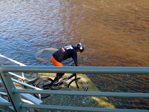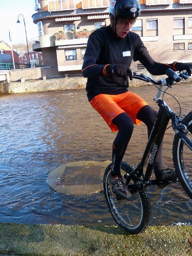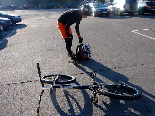 Nur die Reifen dürfen den Boden berühren, jede andere Form von Kontakt bedeutet einen Strafpunkt. Wenn man vom Fahrrad fällt, sich mit beiden Füßen auf dem Boden abstützt oder die Bahn