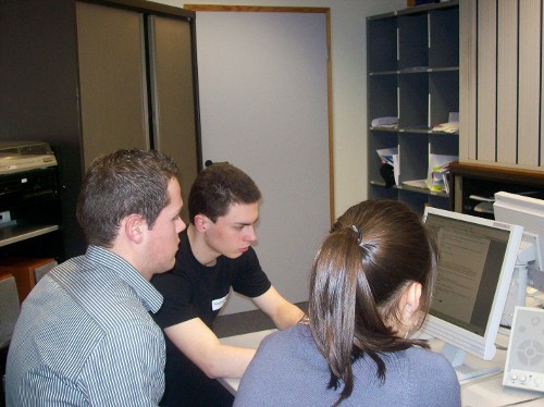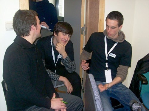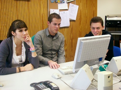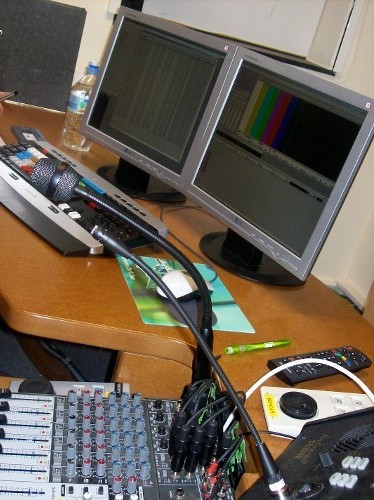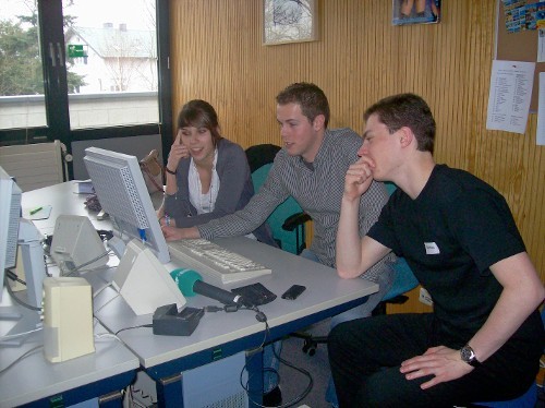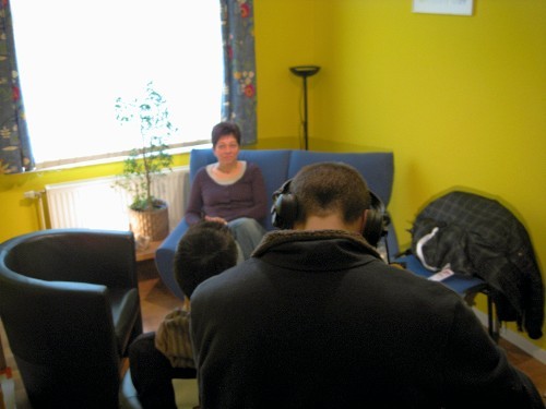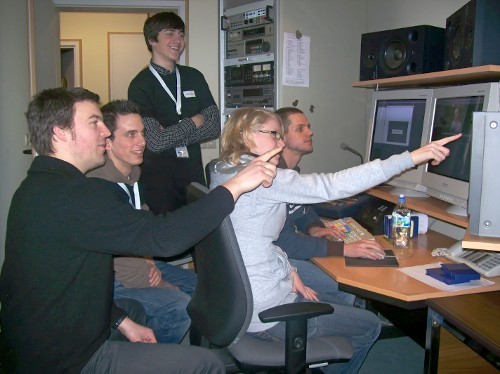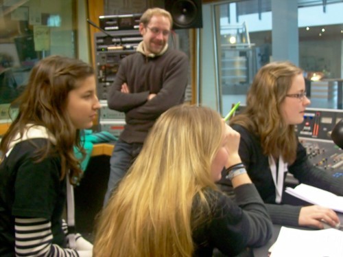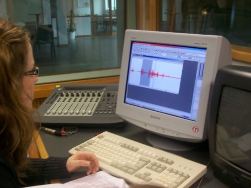 Die Radioleute sind mit dem Schneiden der O-Töne beschäftigt. Danach wird der Text eingesprochen und die Musik wird eingefügt. In ihrem Bericht geht es um den Eupener Dialekt.
