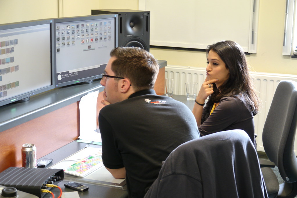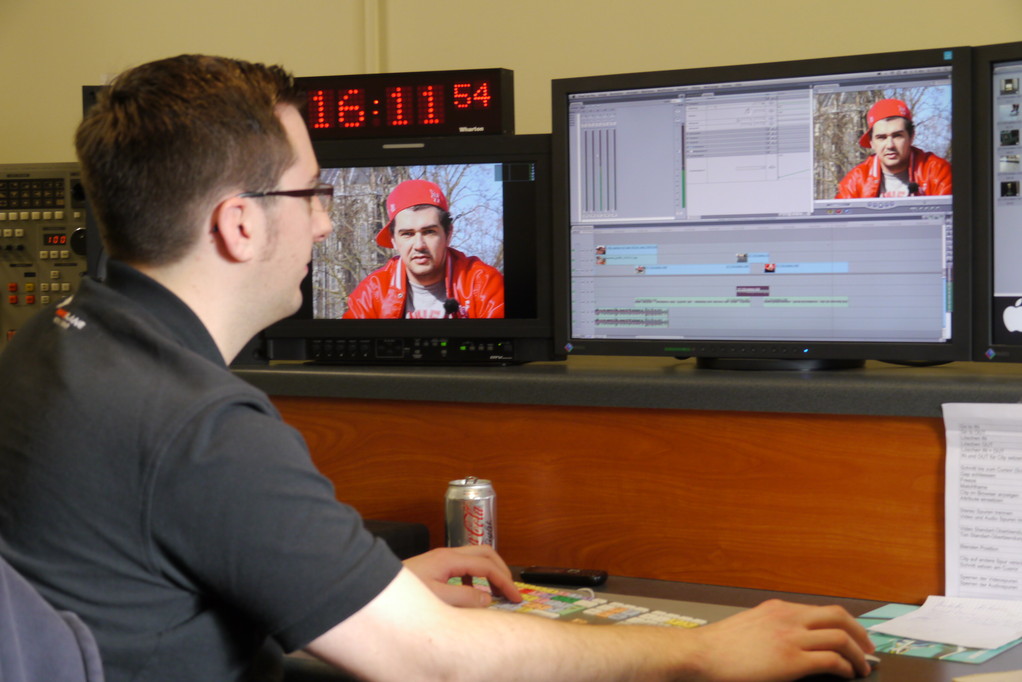 Nachmittags werden Fernseh- und Radiomaterial bearbeitet und zusammen geschnitten.