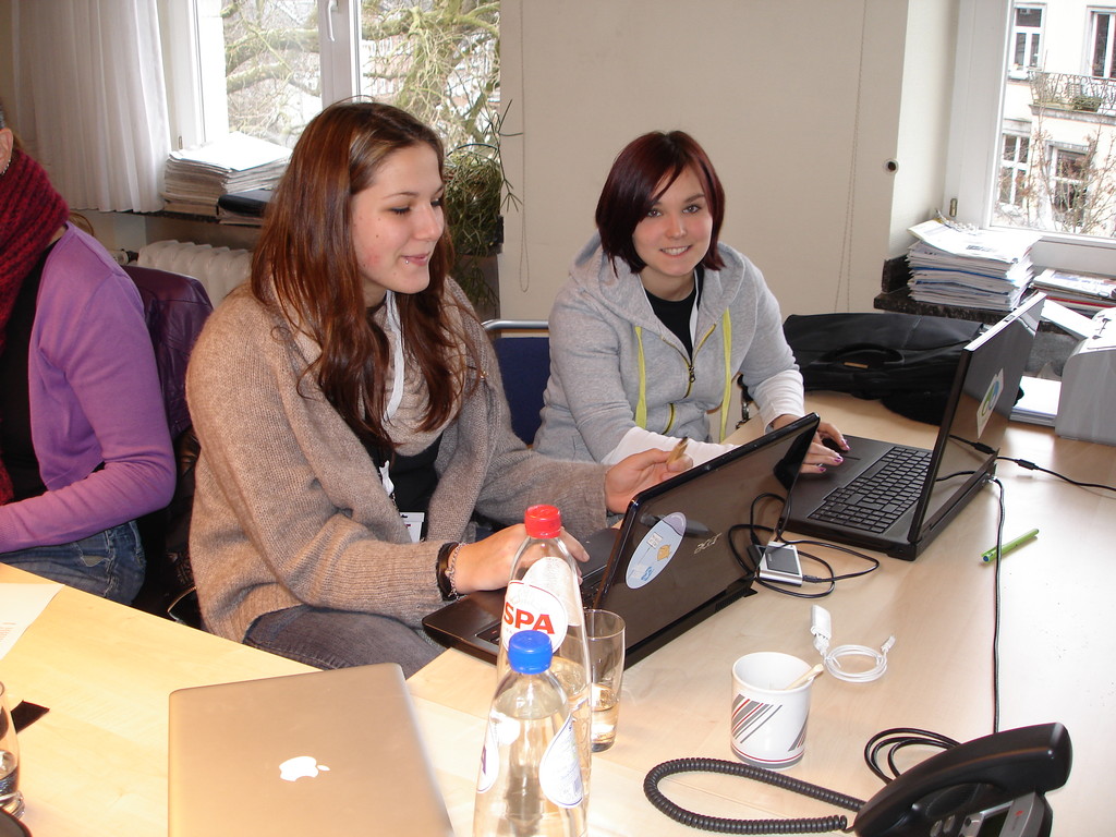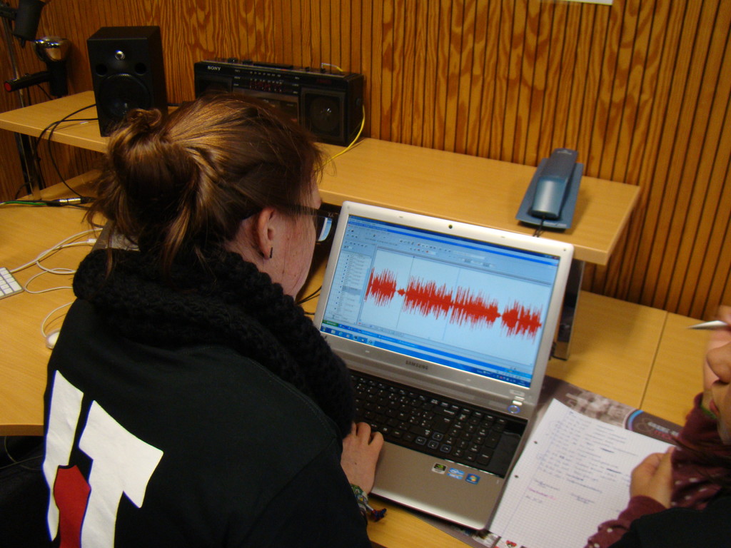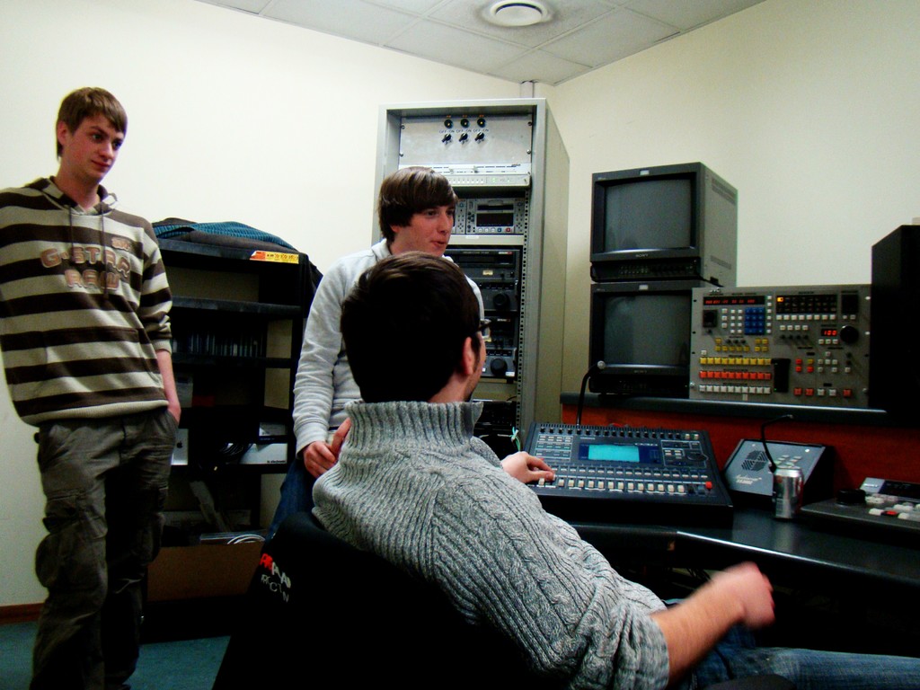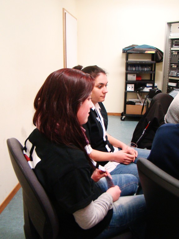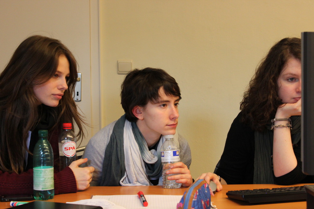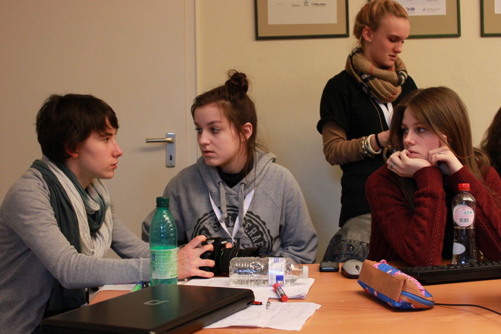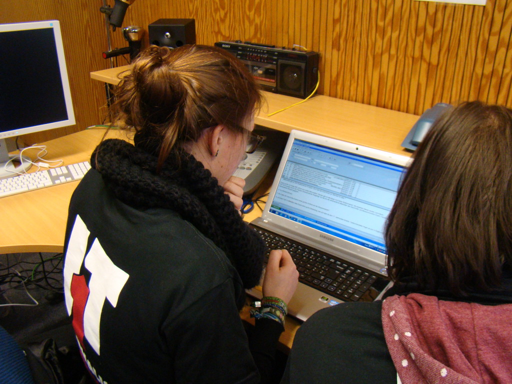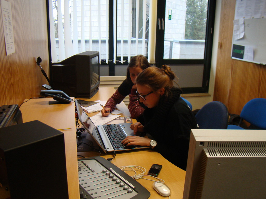 Die eine Gruppe schneidet gerade den Beitrag über das Asylbewerberheim, die andere bereitet ihren Beitrag über die Straßennahmen in Eupen vor!