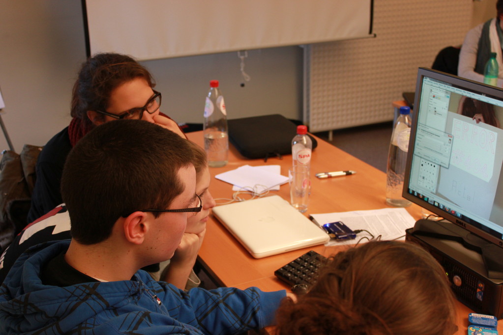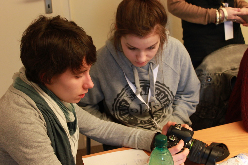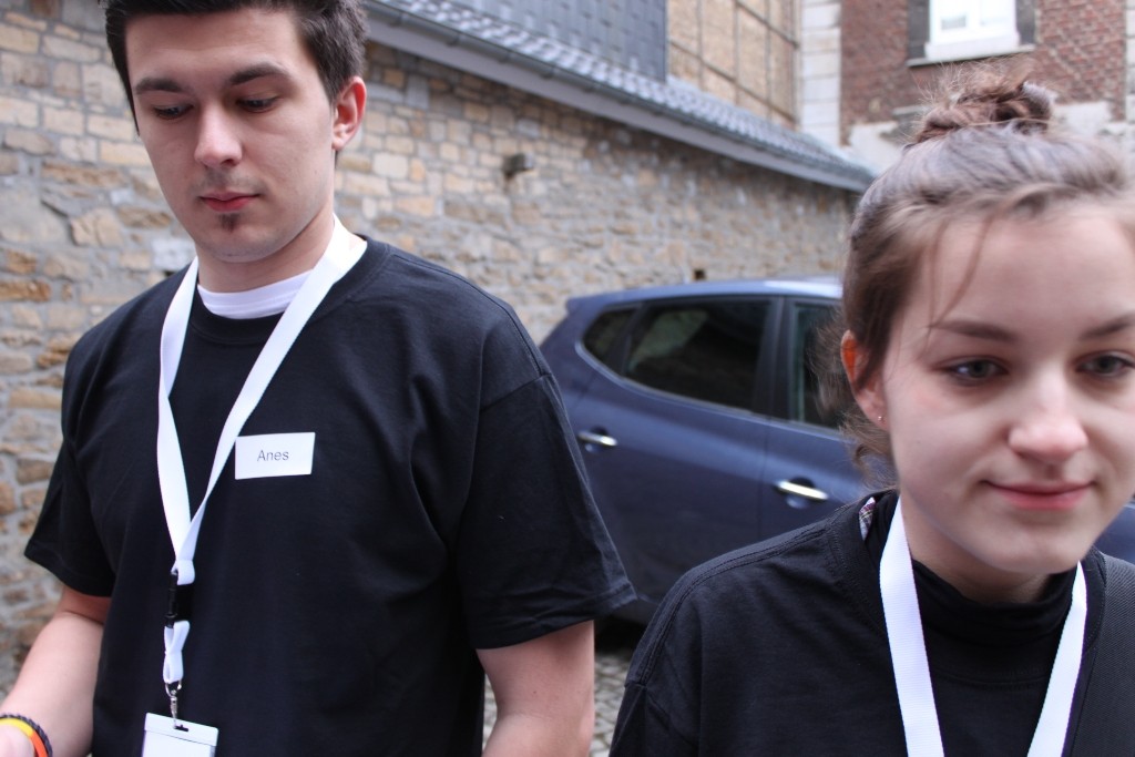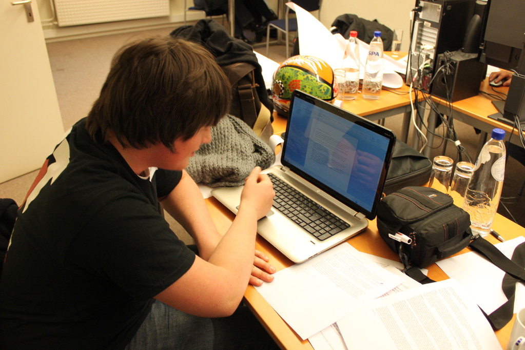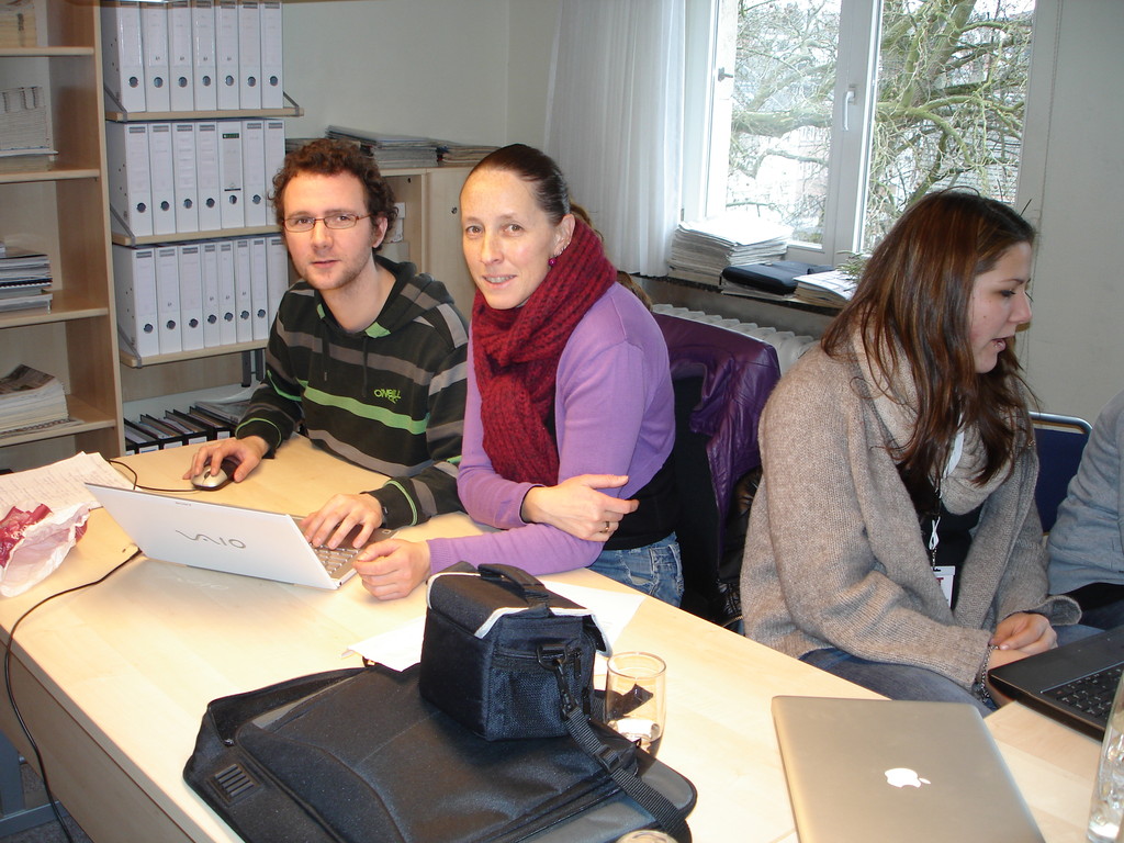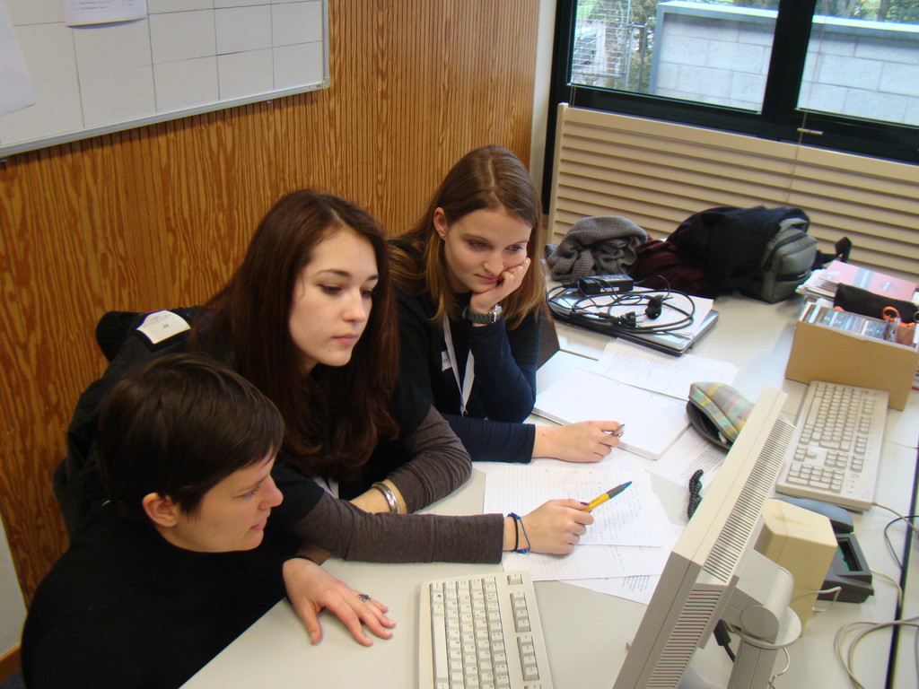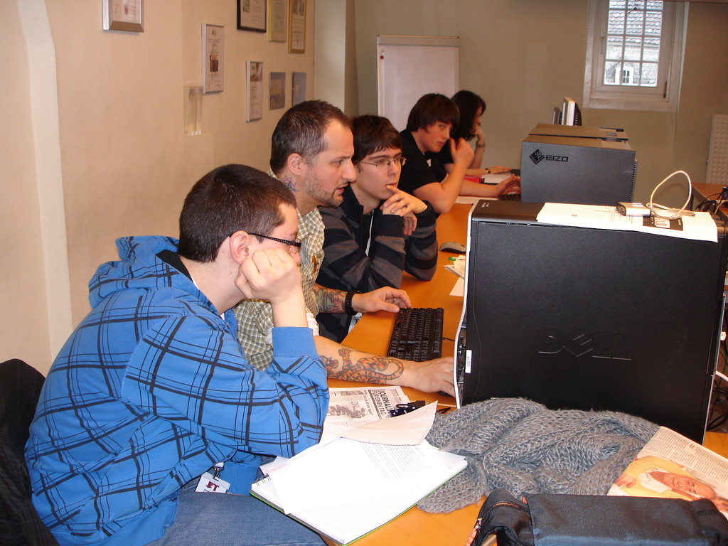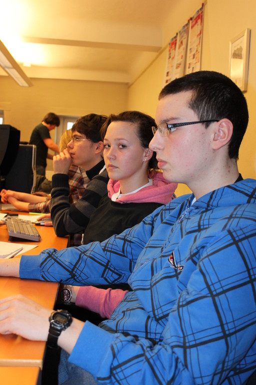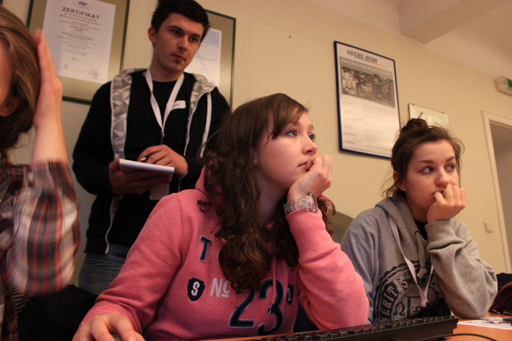 Die eine Gruppe schneidet gerade den Beitrag über das Asylbewerberheim, die andere bereitet ihren Beitrag über die Straßennahmen in Eupen vor!