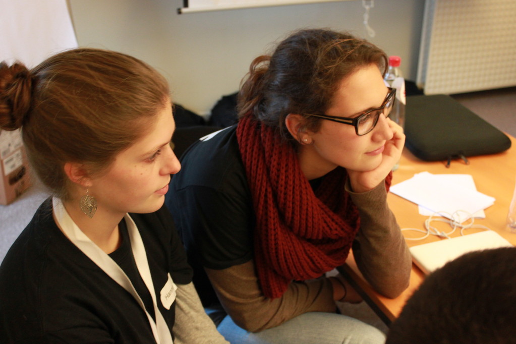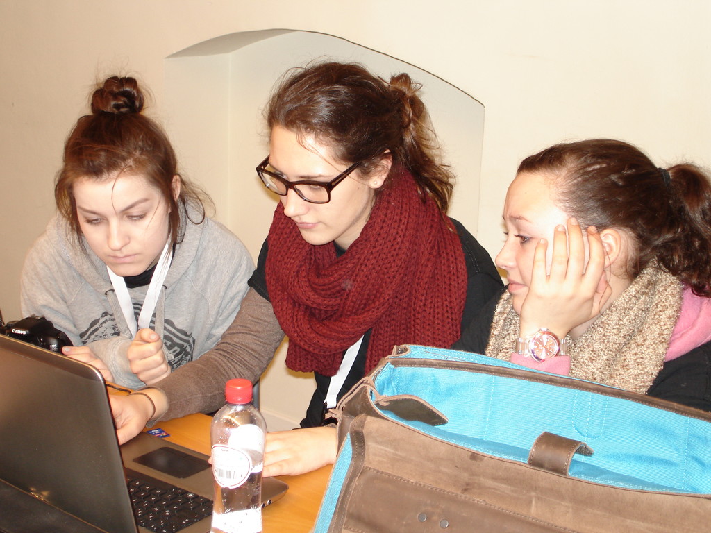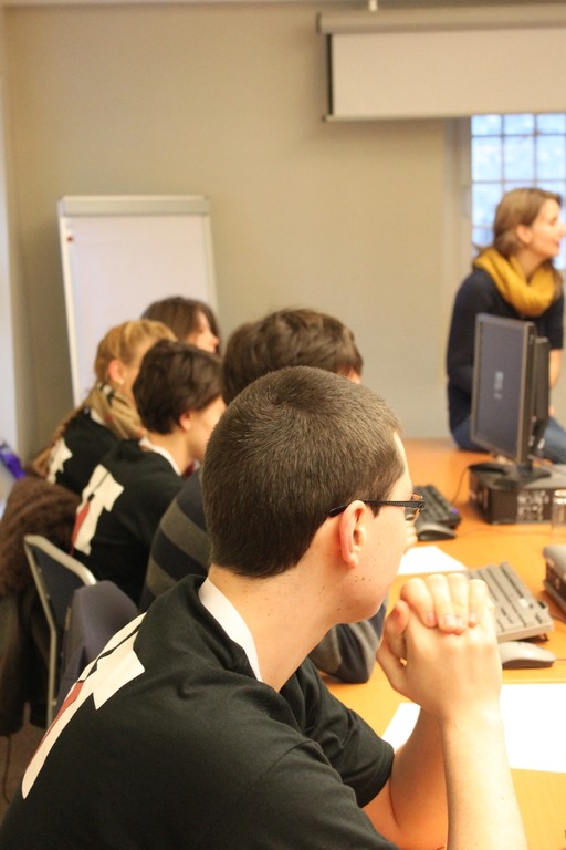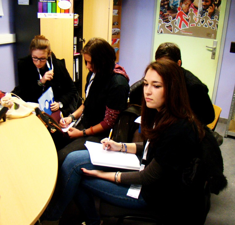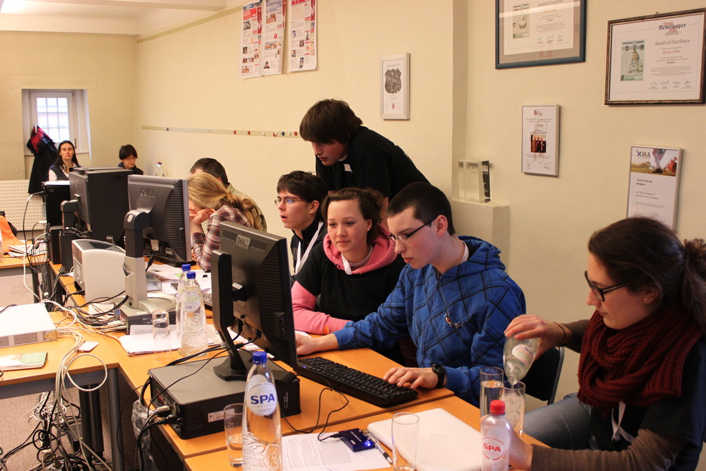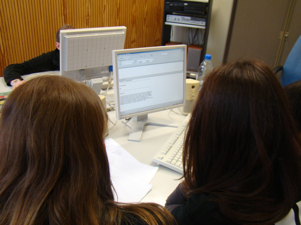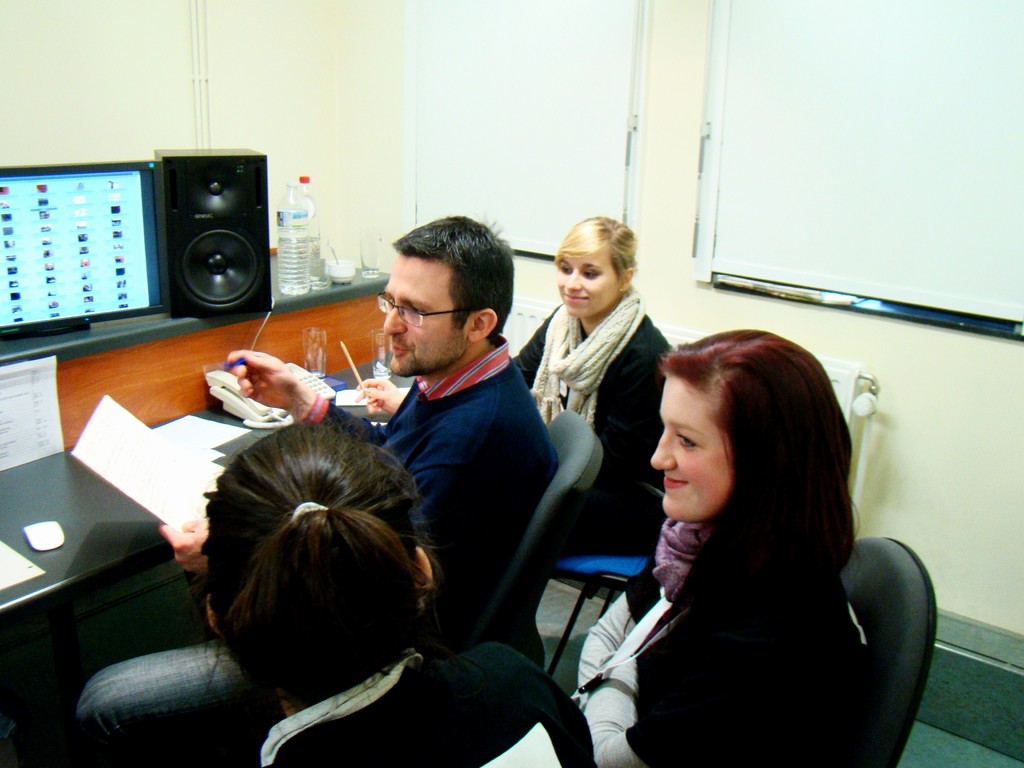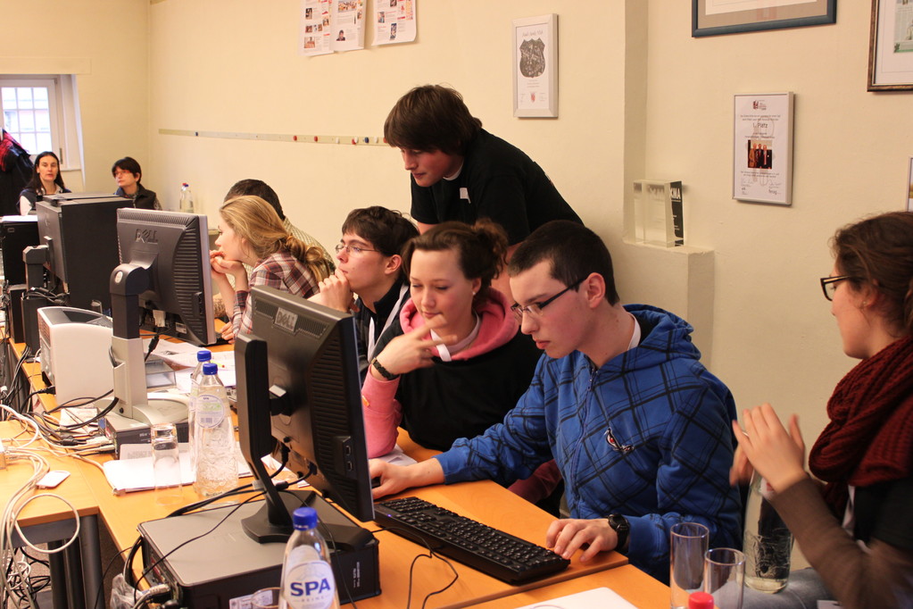 Die eine Gruppe schneidet gerade den Beitrag über das Asylbewerberheim, die andere bereitet ihren Beitrag über die Straßennahmen in Eupen vor!