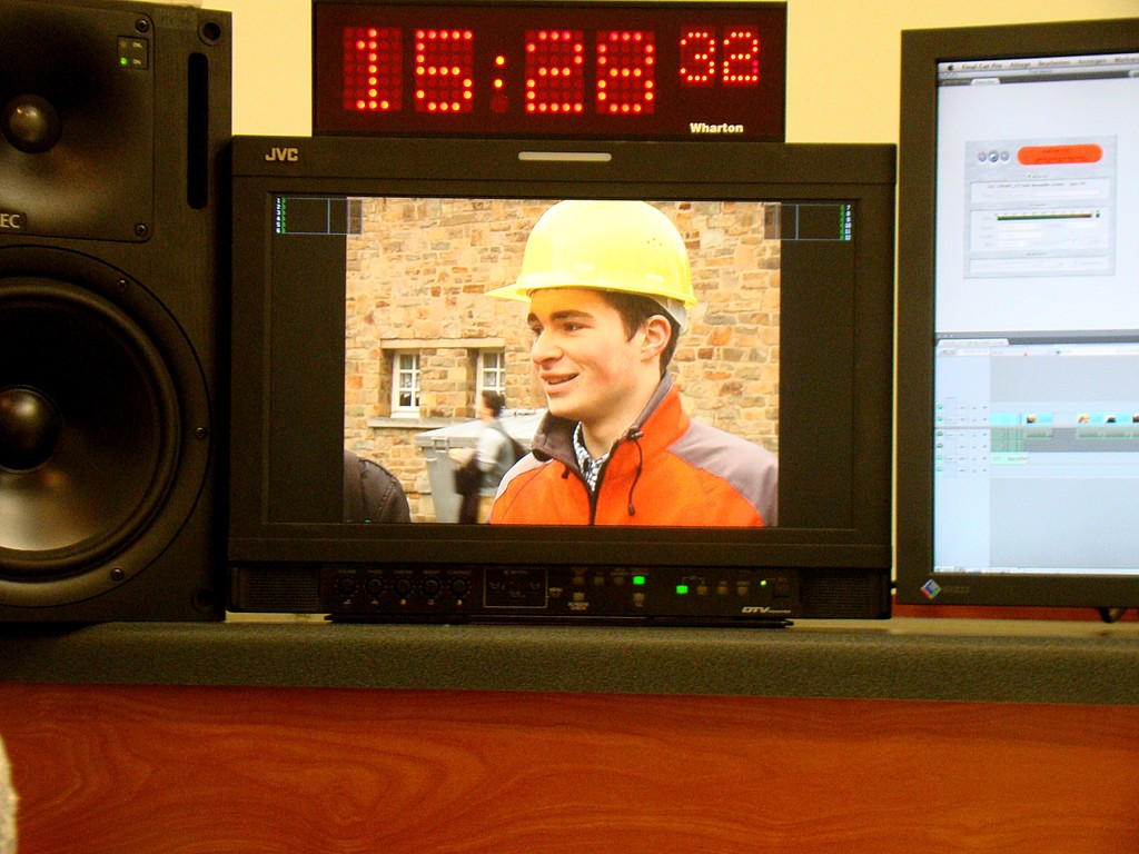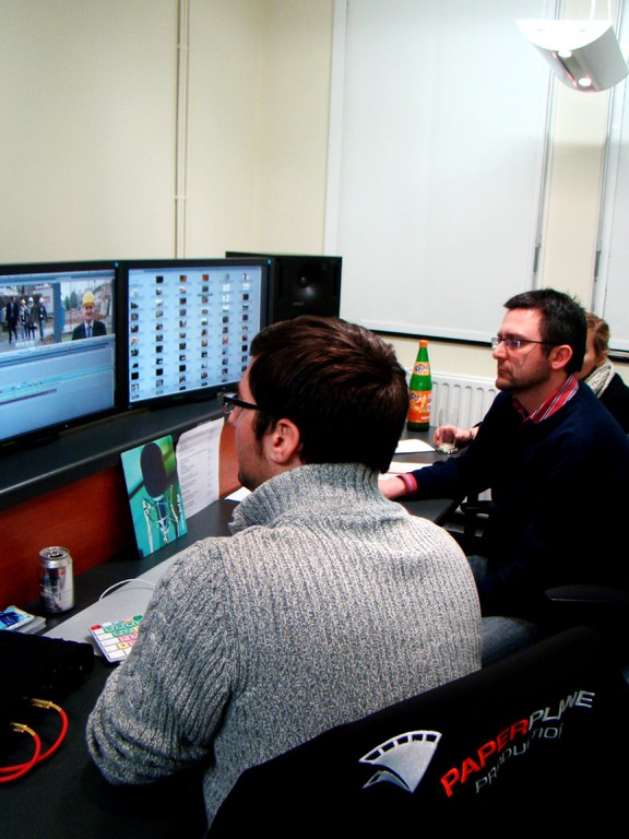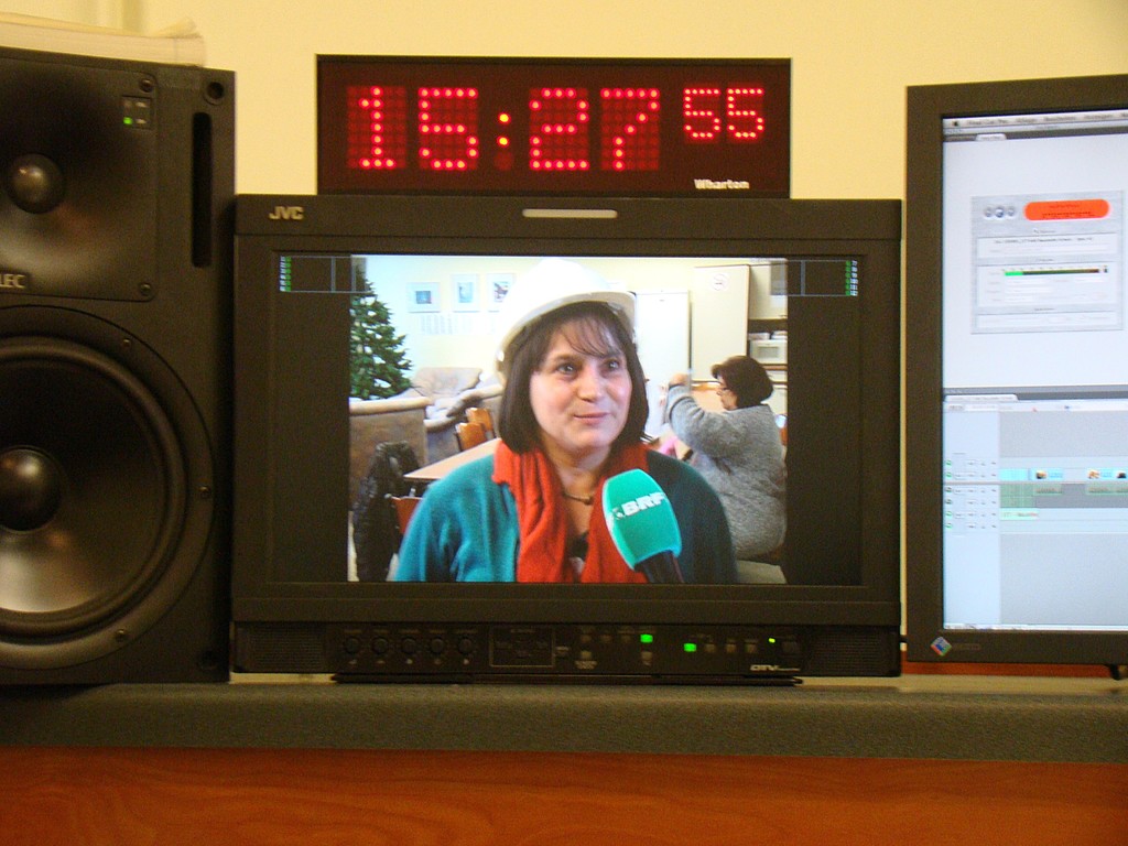 Nach vielen Videoaufnahmen muss das Ganze noch passend für das Fernsehen gemacht werden. Heute Nachmittag hat sich das Fernseh-Team hinter die Computer gesetzt um ihr Werk zu vollenden. Es mussten Bilder geschnitten und Tonaufnahmen gemacht werden, und kurz vor der Ausstrahlung wird dann der Beitrag im Studio noch fertiggestellt. Im BRF setze das Team sich zusammen, um das Beste aus ihrem Material zu selektieren.
