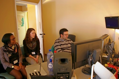 Abelina, Raja und Jan sind nun im BRF Funkhaus angekommen und bereiten ihren Beitrag für's Radio vor. Hier seht ihr wie sie gespannt den Erklärungen lauschen.