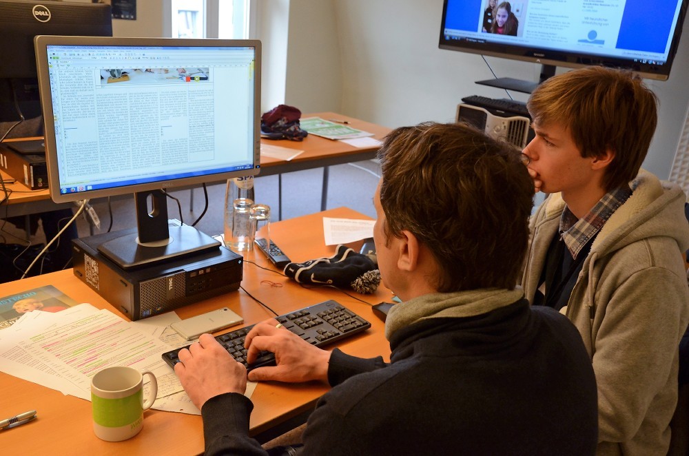 In der Zeitungredaktion läuft die Arbeit auf Hochtouren. Die Schüler des Athenäums planen und feilen fleißig an ihren Artikeln, die bis zum Redaktionsschluss um 17 Uhr fertiggestellt sein müssen. Die Artikel sind soweit Korrektur gelesen und befinden sich auch schon im Layout. Pia und Céline sehen den restlichen Verlauf des Tages positiv: „Irgendwie wird das schon hinhauen“, meint Céline zuversichtlich.